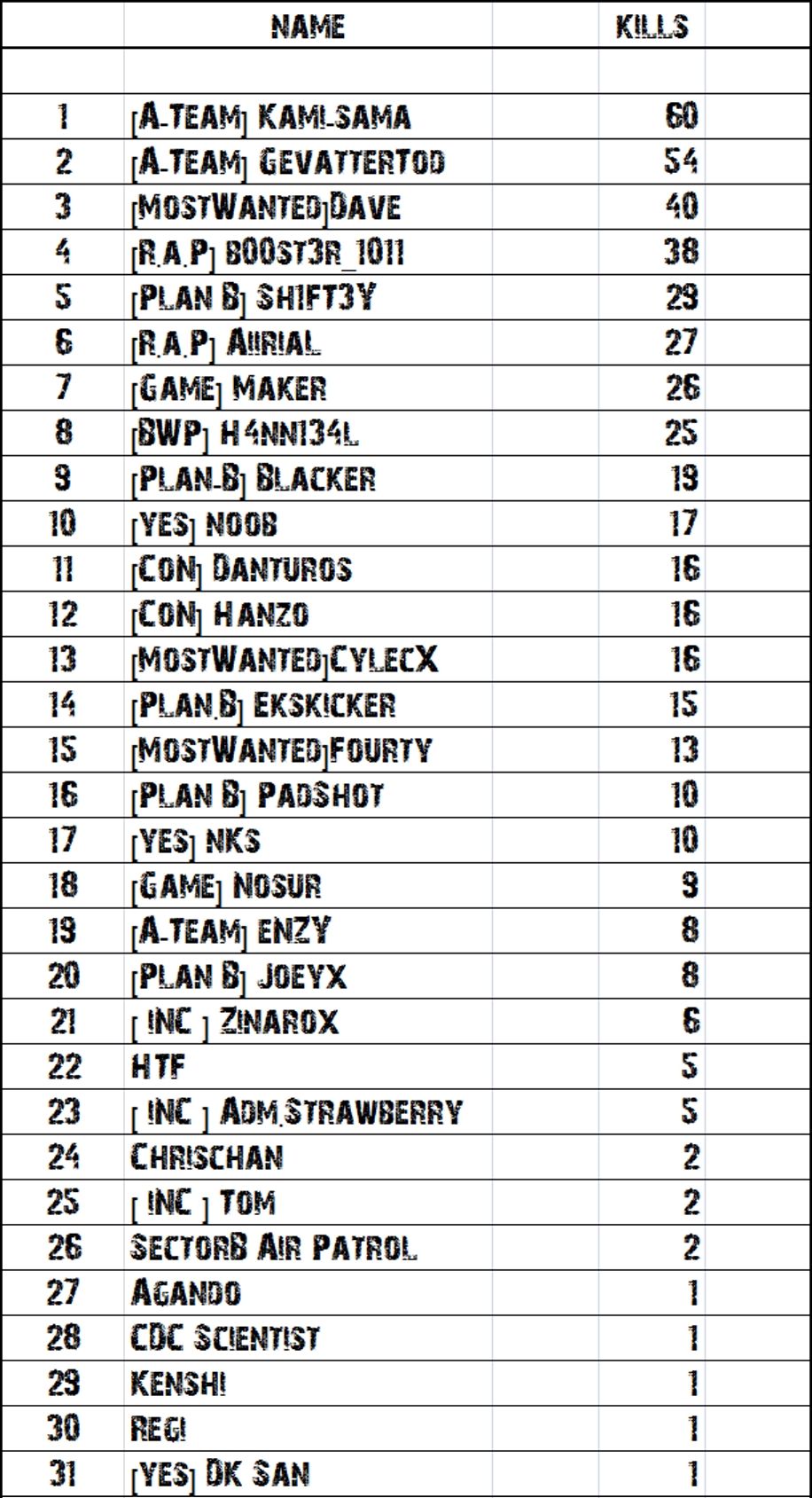 Clan exploZive; Clan Maaskantje; Teriff; H3nni; bambie; Aggromanze; KFJ; NavySniper; [0x00f] Alex; Tobias W.; Clan CL; Alexander H.; Dolan; Blacker; Mike Brewer; Michael W.; Pascal K.; Remi P.; K.G.; Tanky; Hannibal; [420] weirdlytriggered; [FK]Dreifingerjoe; Titan-Heaven; Blank; [BWP] WillivonDichthofen; [420] weirdlytriggered; [420] Calvin; Blank; [DRM] StiflersM0M; [DRM] Peter_Zwegat; Hanzo; [de001]BLSwagger; [BAN] CLAN; Marcus R.; [BJW]Fleiachhammer; Thomas; Capt.Sedaris (V); CottenAsher; ChrisD; Mirko S.; Rex Raglan; [TBH]Foxx1994; [BrB]Mongo-Monkey; [PH]Commando; Twisted;[OBI] El_Tupacco; FbPay Ln; [BrB] Easylife; Errorhead; FbPay Ln; Jimmy Penguin; Morten; [T100]Icegold; Marcin K.; Colin A.; Teriff; Zanmiho; 👍